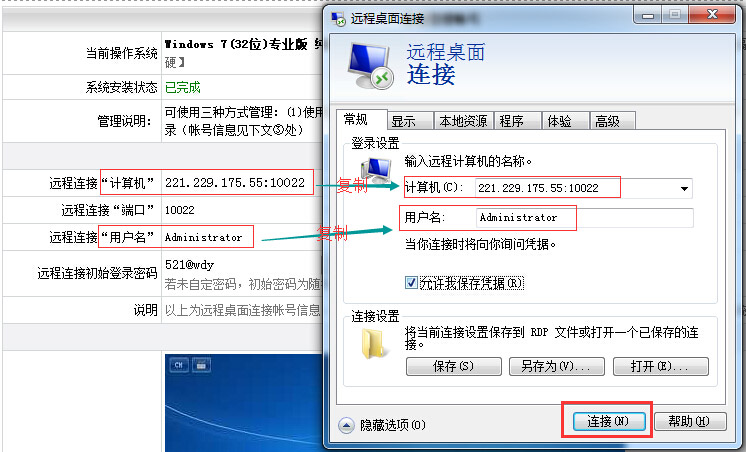 3.复制红色框的IP和用户名Administrator(注意不要复制到空格),如图:
