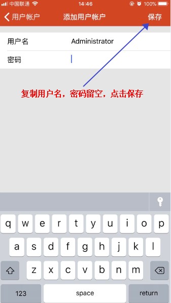 5.复制用户名[红色框部分]Administrator密码留空不要填写!!然后点击保存