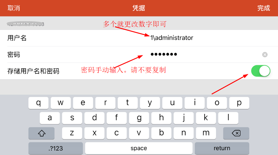 其实app和windows下的远程桌面连接程序稍有不同.windows下,直接输入用户名及密码,windows则会保存连接.
