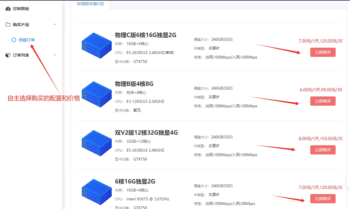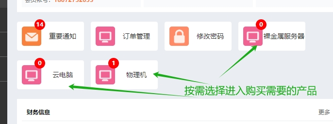 2.充值成功后,根据自身需求购买点击进入购买相对应产品:点击物理机/云电脑/裸金属服务器/
