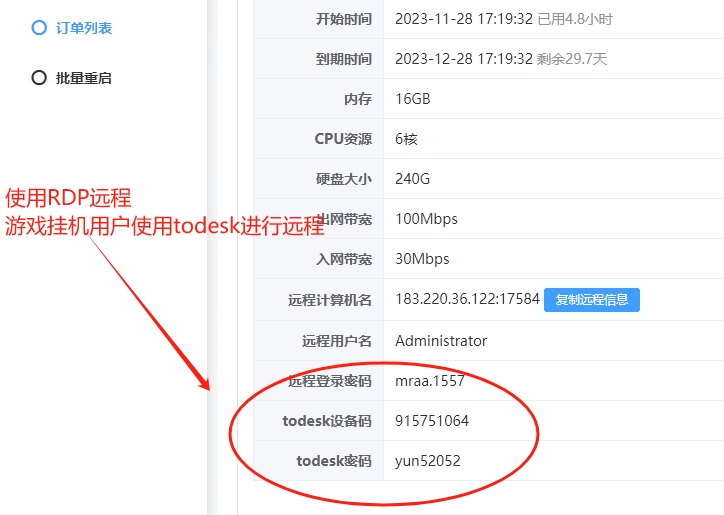 5.开通成功 进入订单列表点击RDP值获得相应的todesk远程码