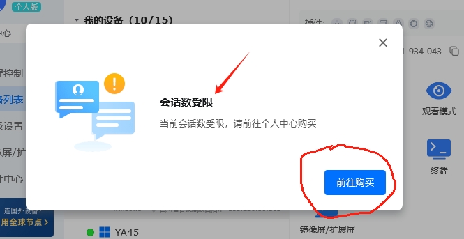 电脑端提示:当前会话数受限,请前往个人中心购买